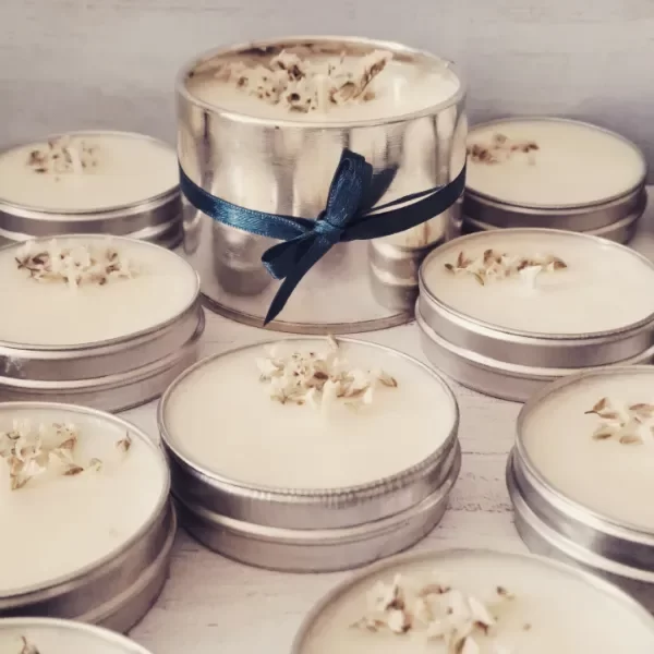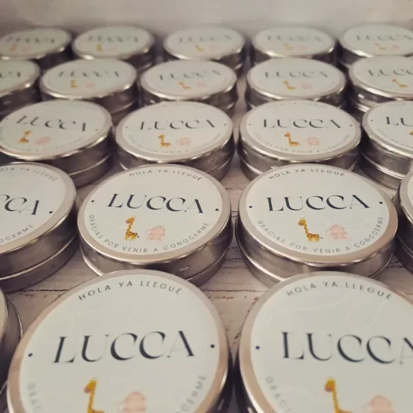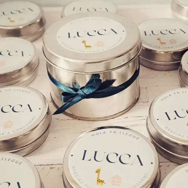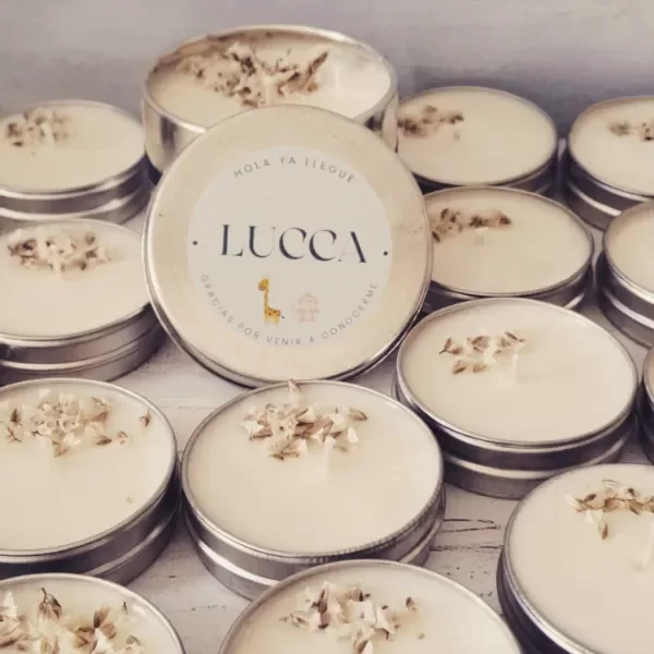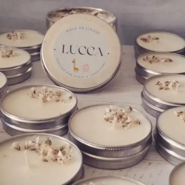 Incluye 10 velas de cera de soja aromática realizadas en latitas pastilleras color plateado de 5,8 x 2. Son personalizadas con sticker en la tapa y flores secas en su interior. Incluye lata central para homenajeado.